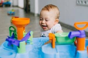 Try it: No water table? That’s ok! Water play can be so simple–Fill a bucket or container with sponges, measuring cups, rubber toys, silverware, a pitcher, or even leaves and let your child have at it! Ice and food coloring would be another fun addition that increases the sensory play, as well!